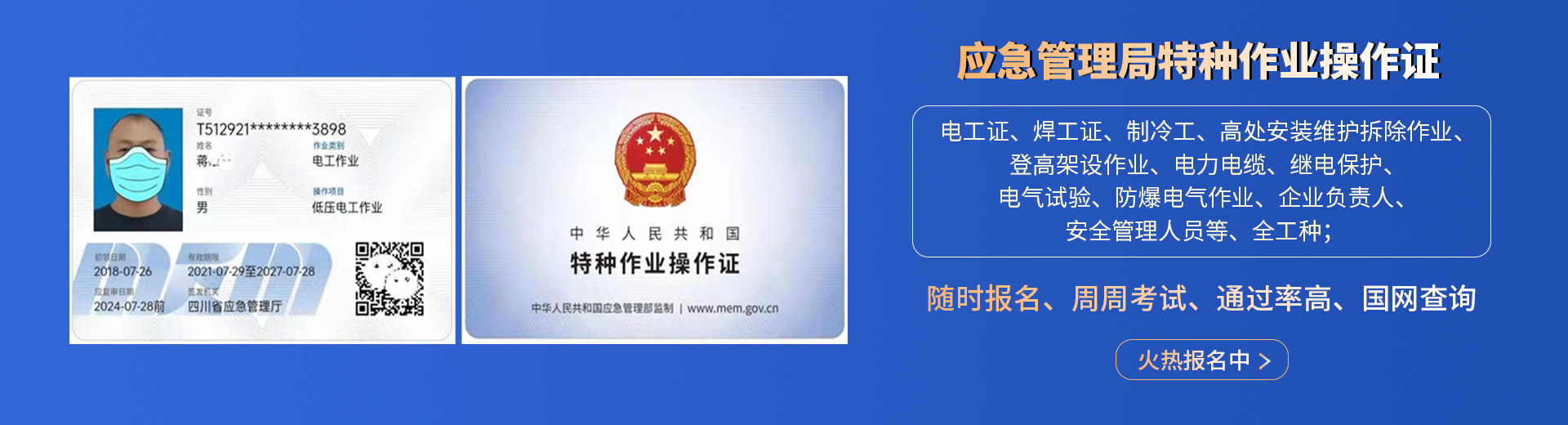 電工證,焊工證,登高架設證,高處安裝維護拆除證,電力電纜證,繼電保護證,電氣實驗證,防爆電器作業證,制冷工證,主要負責人證,安全管理人員證